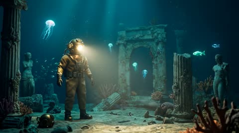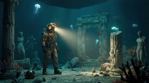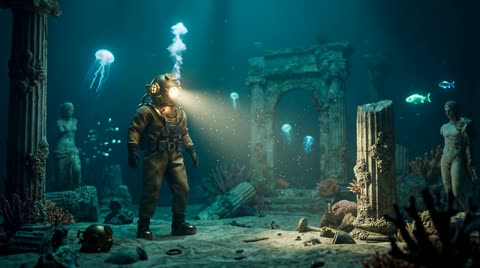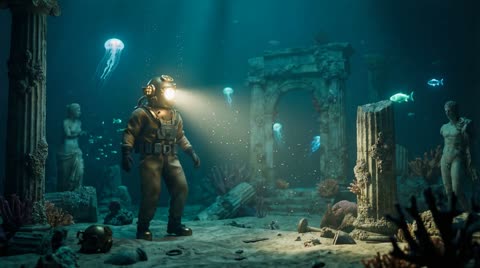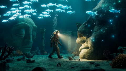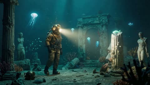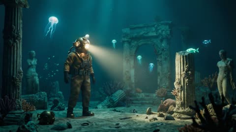 “The diver's helmet light flickers, illuminating swirling particles and a massive stone face half-buried in the seafloor. Schools of small bioluminescent fish scatter from the light beam. The diver takes slow, heavy steps forward and reaches out to touch the ancient carving. As contact is made, the statue's eyes begin to glow faintly. More lights awaken throughout the ruins - an entire sunken city coming alive in the darkness. The diver steps back as something enormous shifts in the shadows beyond. Lovecraftian wonder meets underwater Prometheus.