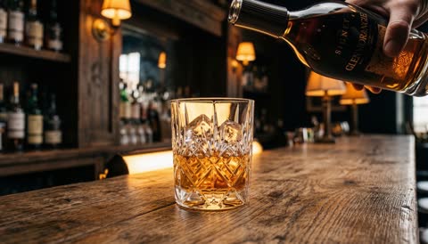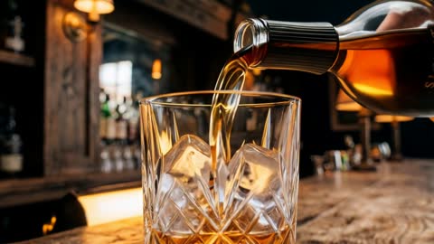 “Whiskey begins pouring in extreme slow motion - the amber liquid catches light like liquid gold as it falls. It hits the ice cubes and splashes upward in a perfect crown formation. The ice cracks slightly from the temperature change, tiny fractures spreading like lightning. The liquid settles and swirls around the cubes. Camera slowly orbits the glass as condensation forms on the crystal surface. Rich, indulgent, masculine luxury energy.