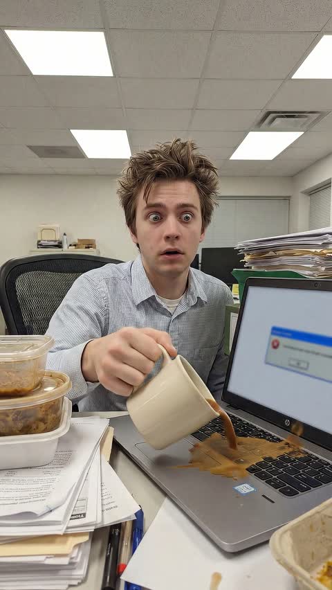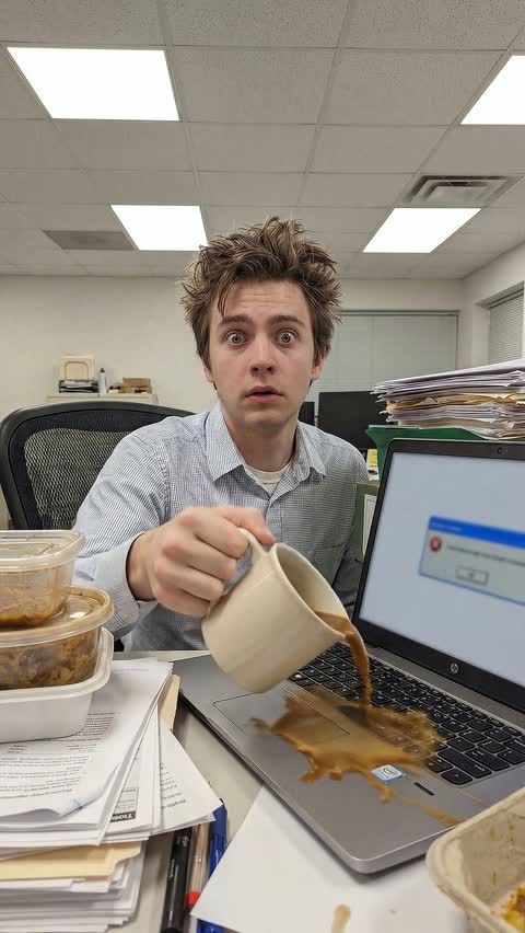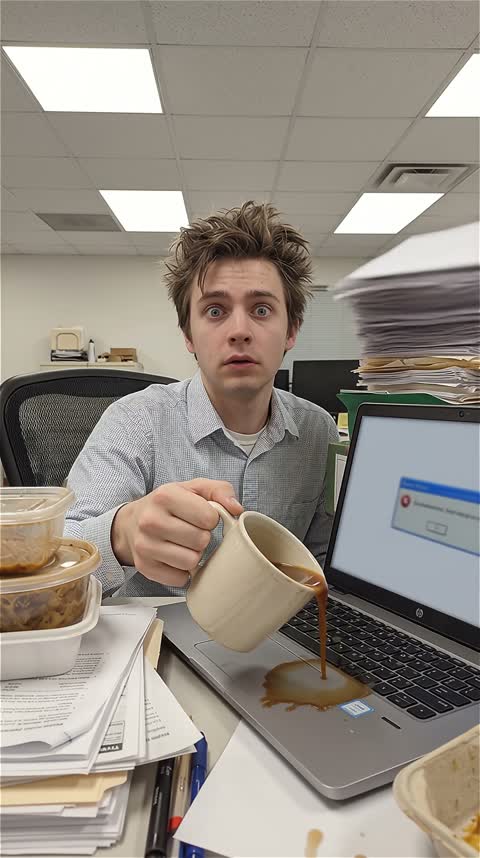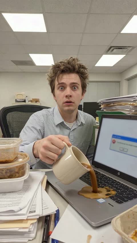 “Everything goes wrong in slow motion. The coffee tips and spills across the keyboard. A stack of papers catches the breeze from an AC vent and explodes into the air. The laptop screen flashes with error messages. The person's eye twitches slightly. They slowly turn to look directly at the camera with a dead-inside smile while chaos unfolds around them. Papers float down like snow. Dark comedy, relatable corporate horror.